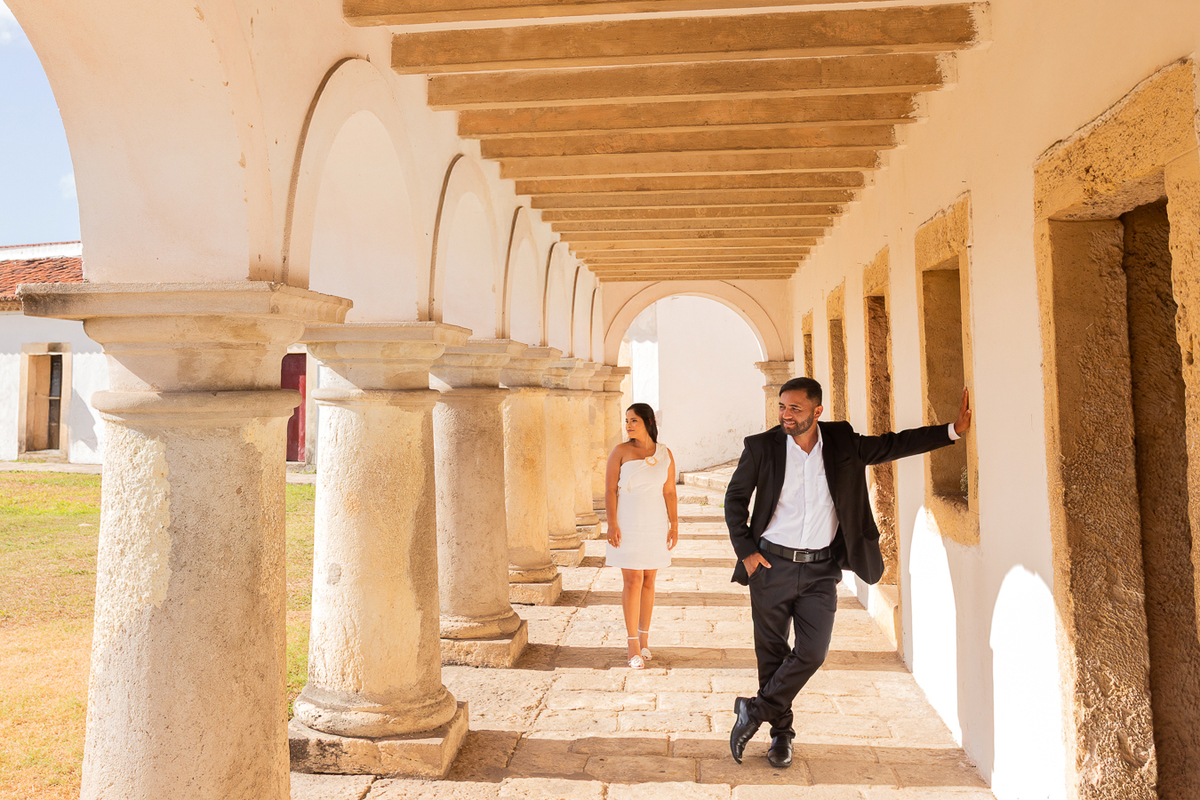 Começamos o ensaio no Forte de Cabedelo, onde o estilo leve e elegante dos dois combinou perfeitamente com a atmosfera histórica e cheia de charme do lugar. Entre sorrisos, trocas de carinho e poses espontâneas, o cenário ganhou vida com a conexão linda desse casal. Teve óculos estilosos, looks despojados e uma energia contagiante que transbordava em cada clique.